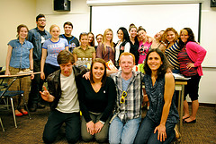 This was a new class and it turned out to be a great one – so we had a party to celebrate. In one short semester the class created their own bogs, learned to capture audio and edit it on Audacity, shoot video and edit it on Final Cut Express, shoot photographs and make audio slideshows, and harness social media to promote their work. We all worked really hard, so, for our last class we had a screening of their final multimedia packages and did a pot-luck to celebrate. Melissa Torres brought her now-famous “Slutty Brownies,” which we had learned about in her blog. Vanessa Cavanagh brought in delicious bean dip. Sam Snowden baked the most adorable heart cookies. Rebecca Kaplan brought in vegan cookies. Laura Romero brought in some real food in the form of pasta. There were lots of other delicious nibbles. And Lisa Nguyen brought in her camera and Nancy Kane, our tech guru, took a picture of the class (which I’ve used here.) That’s Nicholas Shapiro, our class TA, front left, looking like a senior who knows he’s about to graduate.
