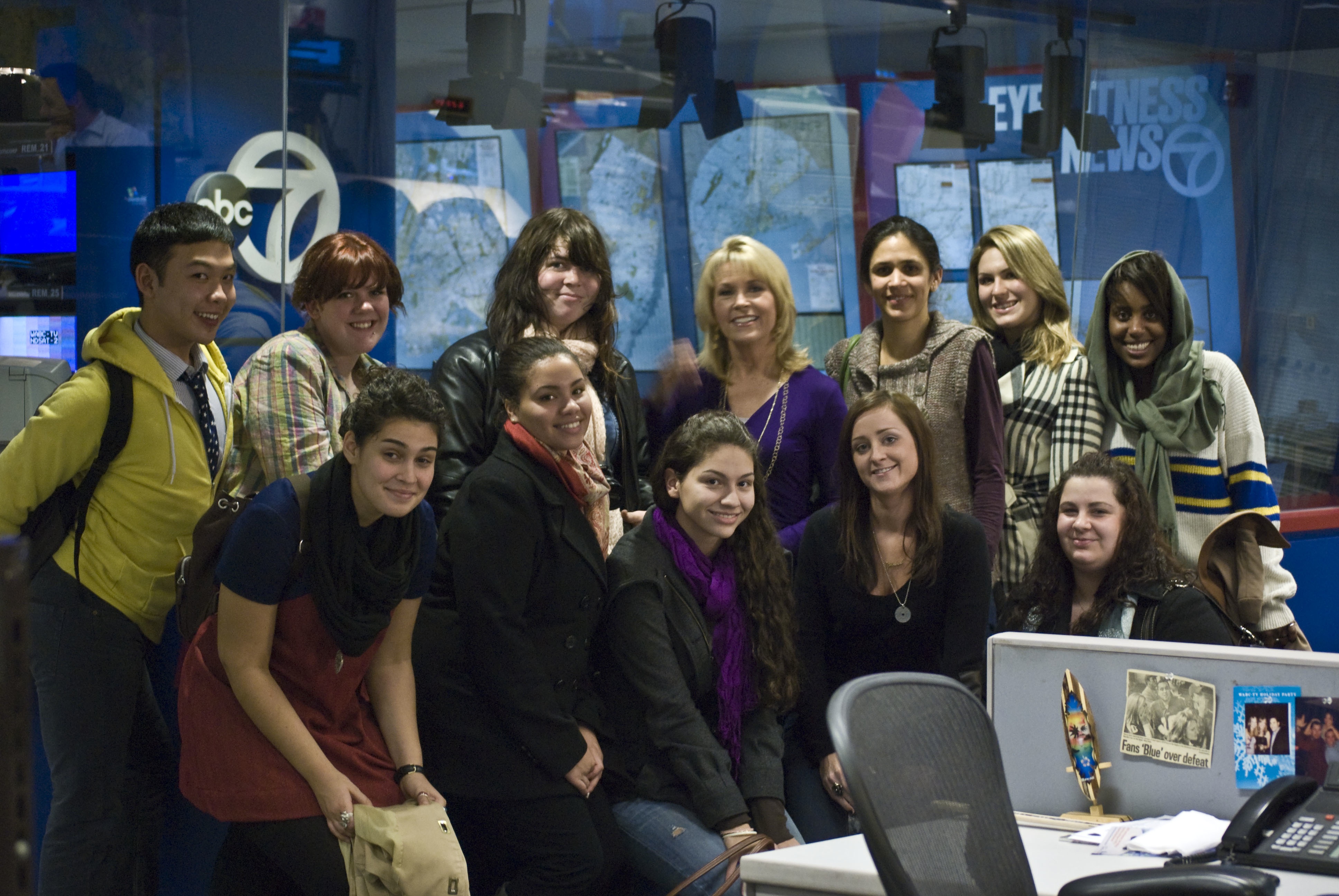 On the set with WABC-TV anchor Michelle Charlesworth. We were on the set and watched an hour of morning news. Afterwards, Charlesworth and her co-anchor and producer met with students to answer questions and share their career advice.